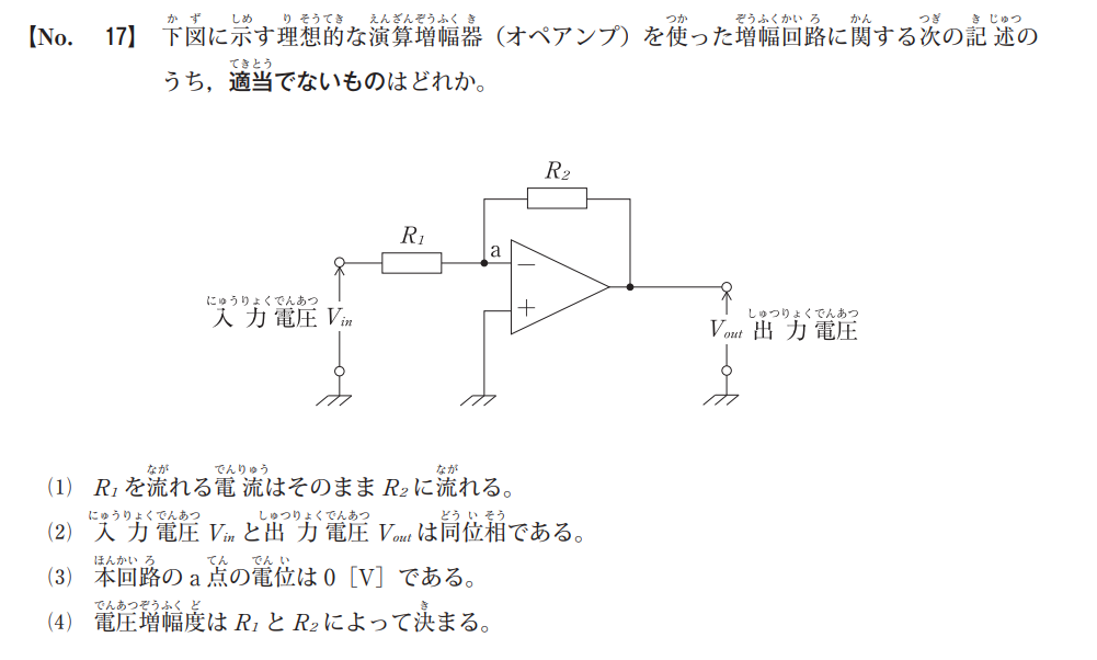 この回路は「反転増幅回路」と呼ばれ、出力電圧はVout=R2R1VinV_{out} = -\frac{R_2}{R_1} V_{in}となります。この「(マイナス)」は位相が 180度反転 することを意味します。したがって、同位相ではなく逆位相です。