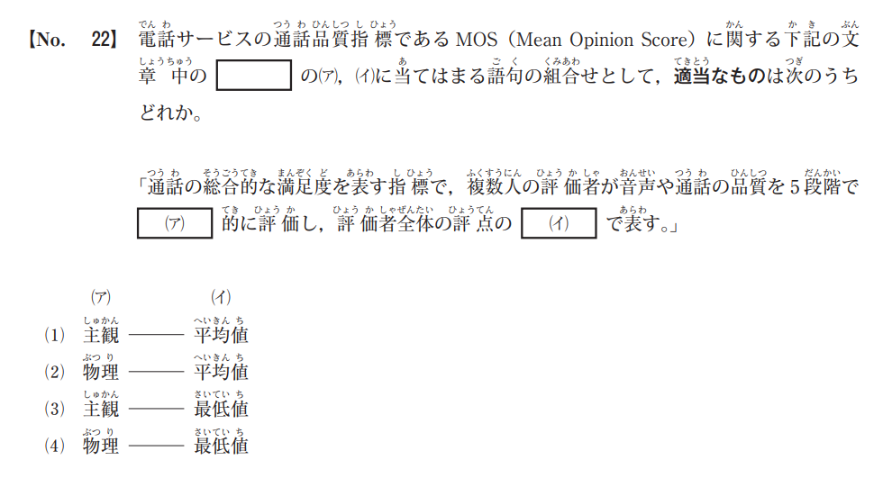 MOSは、実際に人間が音声を聞いて「非常に良い」から「非常に悪い」までの5段階で評価します。機械的な測定ではなく、人の感覚に基づく評価であるため、これは 主観 的評価と呼ばれます。