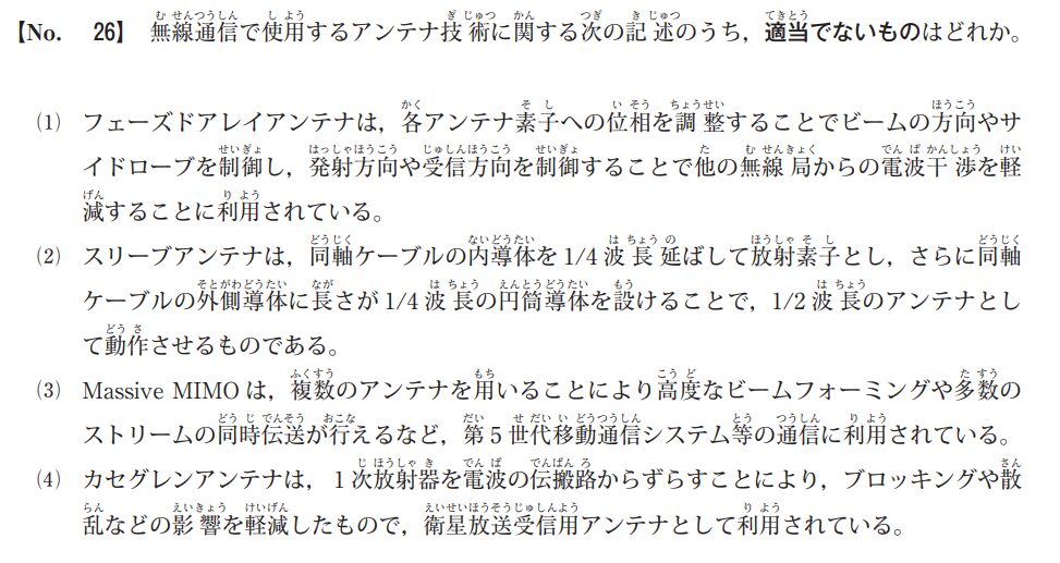 一方、選択肢にある「1 次放射器を伝搬路からずらしてブロッキングを軽減したもの」は オフセットパラボラアンテナ を指します。家庭用の衛星放送受信用アンテナ(BS/CSアンテナ)が少し斜めを向いているのは、このオフセット構造で効率を高めるためです。