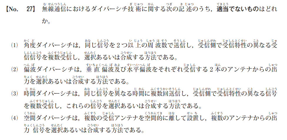 説明文の内容は「周波数ダイバーシチ」のものです。「角度ダイバーシチ」とは、指向性(向き)の異なる複数のアンテナを用いて、異なる方向から届く電波を受信する方法を指します。