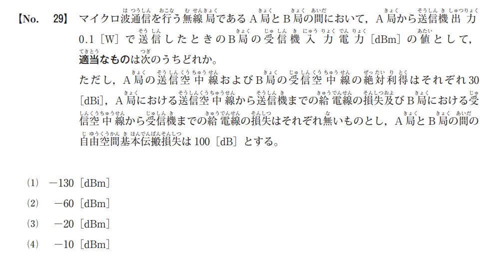 Pr=20 [dBm]+30 [dB]+30 [dB]100 [dB]=20 [dBm]P_r = 20\text{ [dBm]} + 30\text{ [dB]} + 30\text{ [dB]} – 100\text{ [dB]} = -20\text{ [dBm]}