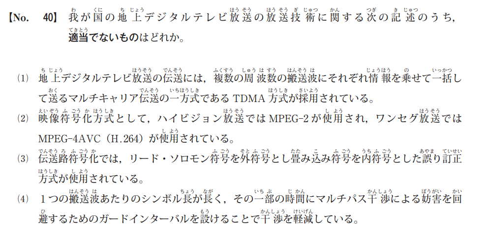 地デジで採用されているマルチキャリア伝送方式は、TDMA(時分割多元接続)ではなく OFDM(直交周波数分割多重) 方式です。