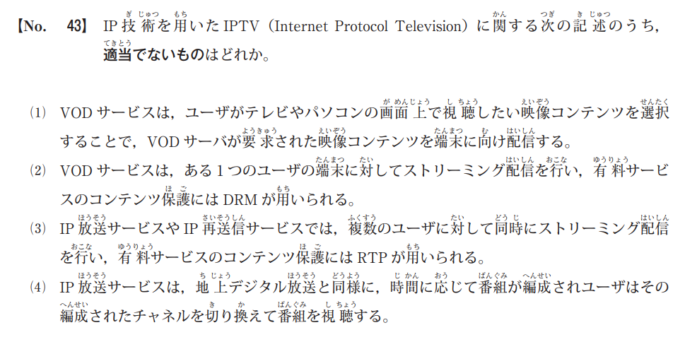 RTP(Real-time Transport Protocol)は、映像や音声などのデータをリアルタイムに伝送するためのプロトコル(通信手順)であり、コンテンツを保護(著作権管理)する機能はありません。