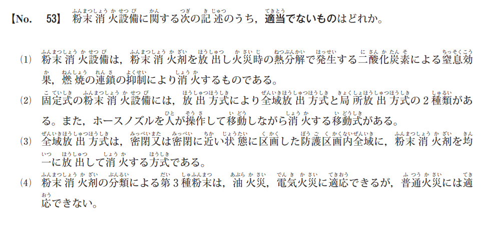 ガス系消火設備と同様、部屋を密閉状態にして濃度を一定以上に保つことで消火します。